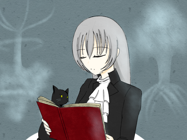 她回頭看著黑貓走到放置在桌面的書邊坐下,懶洋洋地喵叫了一聲——就好像在說「來看書吧」這樣。